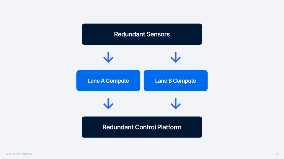 True operational readiness requires a system that manages its own failures as effectively as it navigates road conditions. The Aurora Driver’s Fault Management System (FMS) continuously monitors for software and hardware degradation, instantly flagging and handling issues before they become critical.