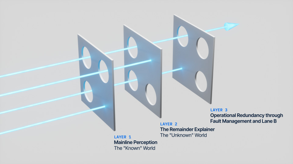 Hardware delivers the raw sensor data, but software makes sense of it. Aurora’s perception stack doesn't rely on a single algorithm or model to interpret the world. Instead, we follow a "Swiss Cheese" approach of multiple, overlapping software layers designed so that the strengths of one layer cover the potential limitations of another.