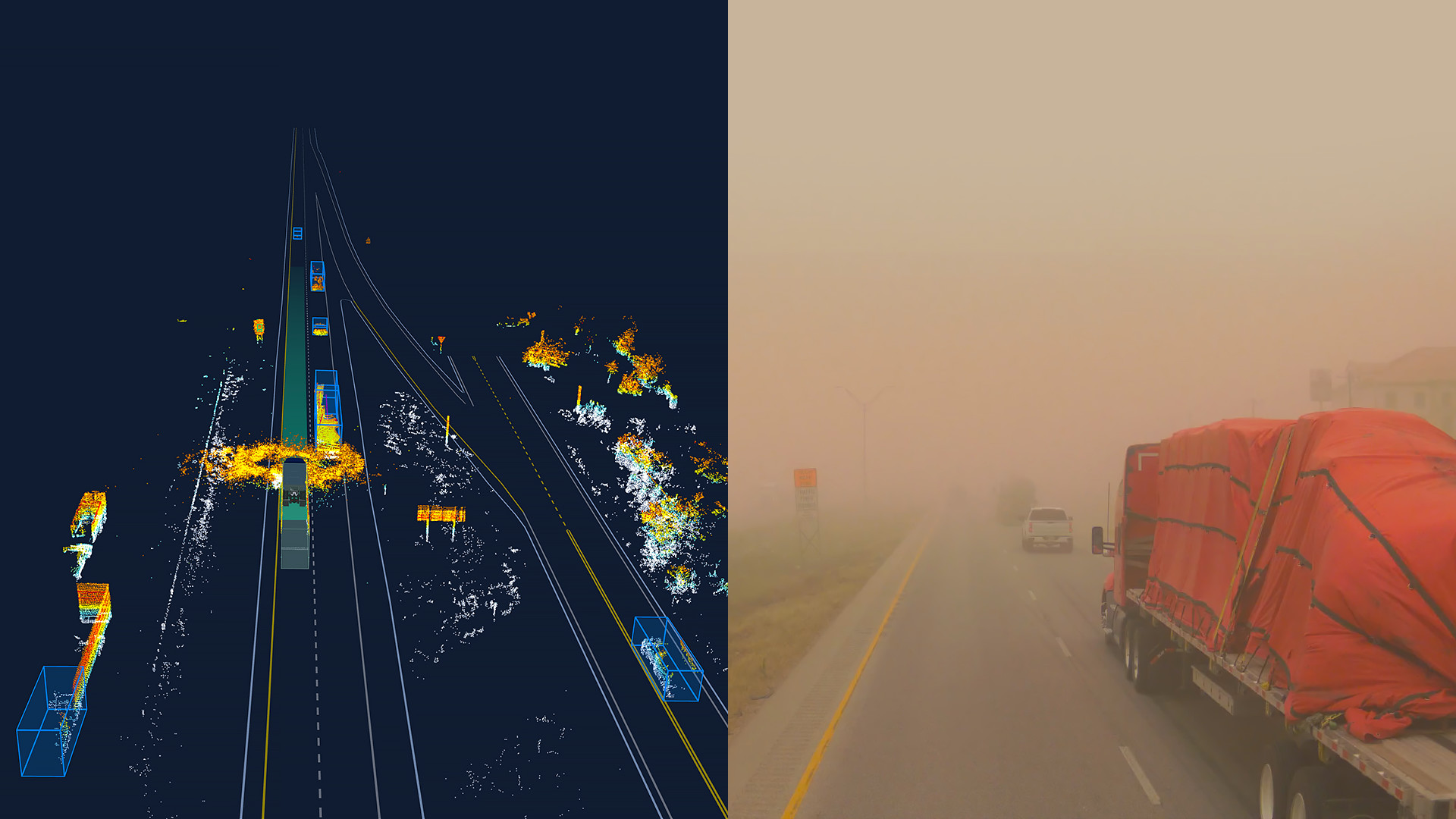 Weather adds another layer of complexity. In operational corridors like Texas and Arizona, fast-moving dust storms can reduce highway visibility to near zero in seconds. These aren't rare edge cases; validating performance in dust-storms was essential to unlocking our driverless lane from Fort Worth to El Paso, as well as preparing for our El Paso-Phoenix extension.